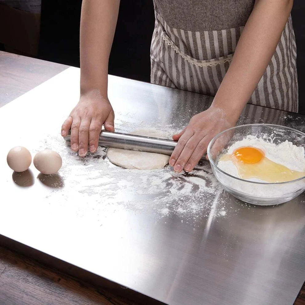 Fabriquée en acier inoxydable, cette planche offre une surface lisse et non poreuse, idéale pour pétrir, étaler et découper. Son design moderne et épuré s’intègre parfaitement dans les cuisines contemporaines.
